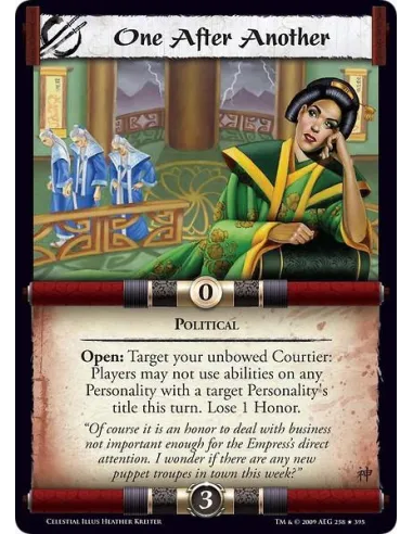 Political Open: Target your unbowed Courtier: Players may not use abilities on any Personality with a target Personality's title this turn. Lose 1 Honor.