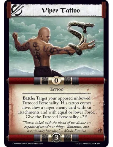 Tattoo Battle: Target your opposed unbowed Tattooed Personality: His tattoo comes alive. Bow a target enemy card without attachments and with equal or lower Force. Give the Tattooed Personality +2F.