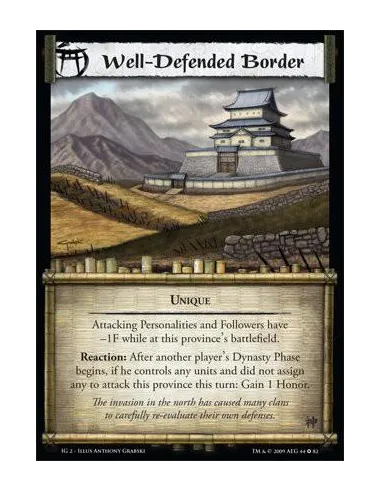 Unique Attacking Personalities and Followers have -1F while at this province’s battlefield. Reaction: After another player’s Dynasty Phase begins, if he controls any units and did not assign any to attack this province this turn: Gain 1 Honor.