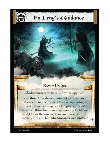 Kami • Unique Shadowlands cards have +1F while opposed. Reaction: After the resolution of an action that destroyed another player’s Personality during a battle, if you are a Spider Clan player, discard this card: Bring him into play, ignoring Gold cost and Honor Requirement, in your current army. Permanently give him Shadowlands and Undead.