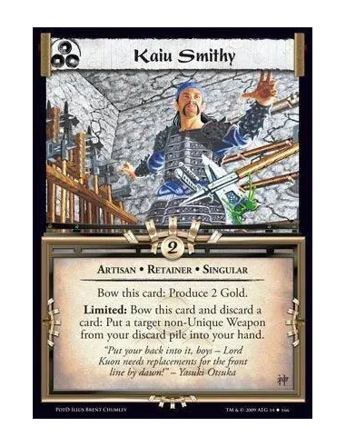 Artisan • Retainer • Singular Bow this card: Produce 2 Gold. Limited: Bow this card and discard a card: Put a target non-Unique Weapon from your discard pile into your hand.