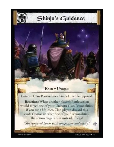 Kami • Unique Unicorn Clan Personalities have +1F while opposed. Reaction: When another player’s Battle action would target one of your Unicorn Clan Personalities, if you are a Unicorn Clan player, discard this card: Choose another one of your Personalities. The action targets him instead, if legal.