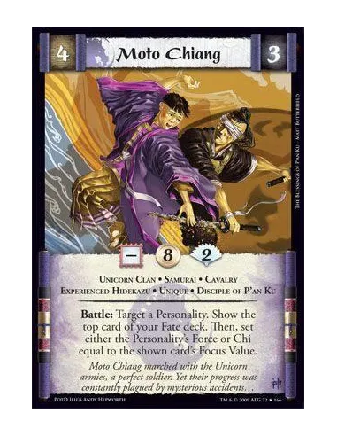 Unicorn Clan • Samurai • Cavalry • Experienced Hidekazu • Unique • Disc iple of P’an Ku Battle: Target a Personality. Show the top card of your Fate deck. Then, set either the Personality’s Force or Chi equal to the shown card’s Focus Value.
