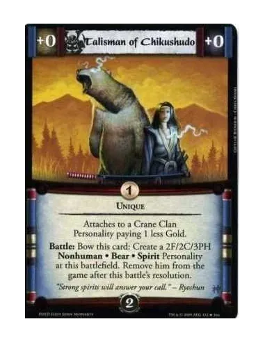 Unique Attaches to a Crane Clan Personality paying 1 less Gold. Battle: Bow this card: Create a 2F/2C/3PH Nonhuman • Bear • Spirit Personality at this battlefield. Remove him from the game after this battle’s resolution.
