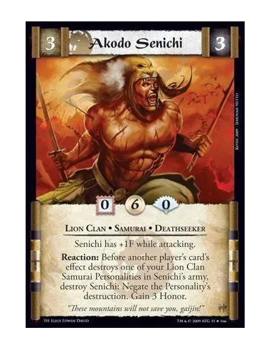 Lion Clan • Samurai • Deathseeker Senichi has +1F while attacking. Reaction: Before another player’s card’s effect destroys one of your Lion Clan Samurai Personalities in Senichi’s army, destroy Senichi: Negate the Personality’s destruction. Gain 3 Honor.