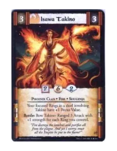 Phoenix Clan • Fire • Shugenja Your focused Rings in a duel involving Takino have +1 Focus Value. Battle: Bow Takino: Ranged 3 Attack with +1 strength for each Ring you control.