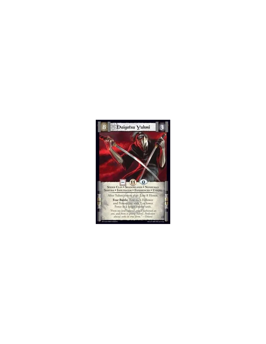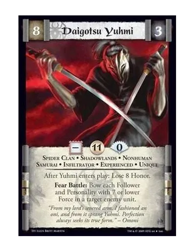 Spider Clan • Shadowlands • Nonhuman • Samurai • Infiltrator • Experienced • Unique After Yuhmi enters play: Lose 8 Honor. Fear Battle: Bow each Follower and Personality with 7 or lower Force in a target enemy unit.