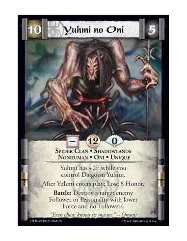 Spider Clan • Shadowlands • Nonhuman • Oni • Unique Yuhmi has +2F while you control Daigotsu Yuhmi. After Yuhmi enters play: Lose 8 Honor. Battle: Destroy a target enemy Follower or Personality with lower Force and no Followers.