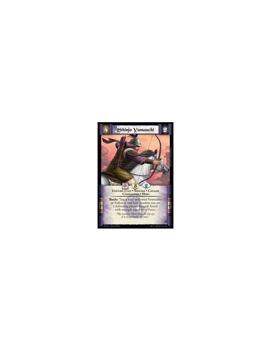 Unicorn Clan • Samurai • Cavalry • Commander • Hero Battle: Target your unbowed Personality or Follower, and bow it unless you are a defending player: Ranged Attack with strength equal to its Force.