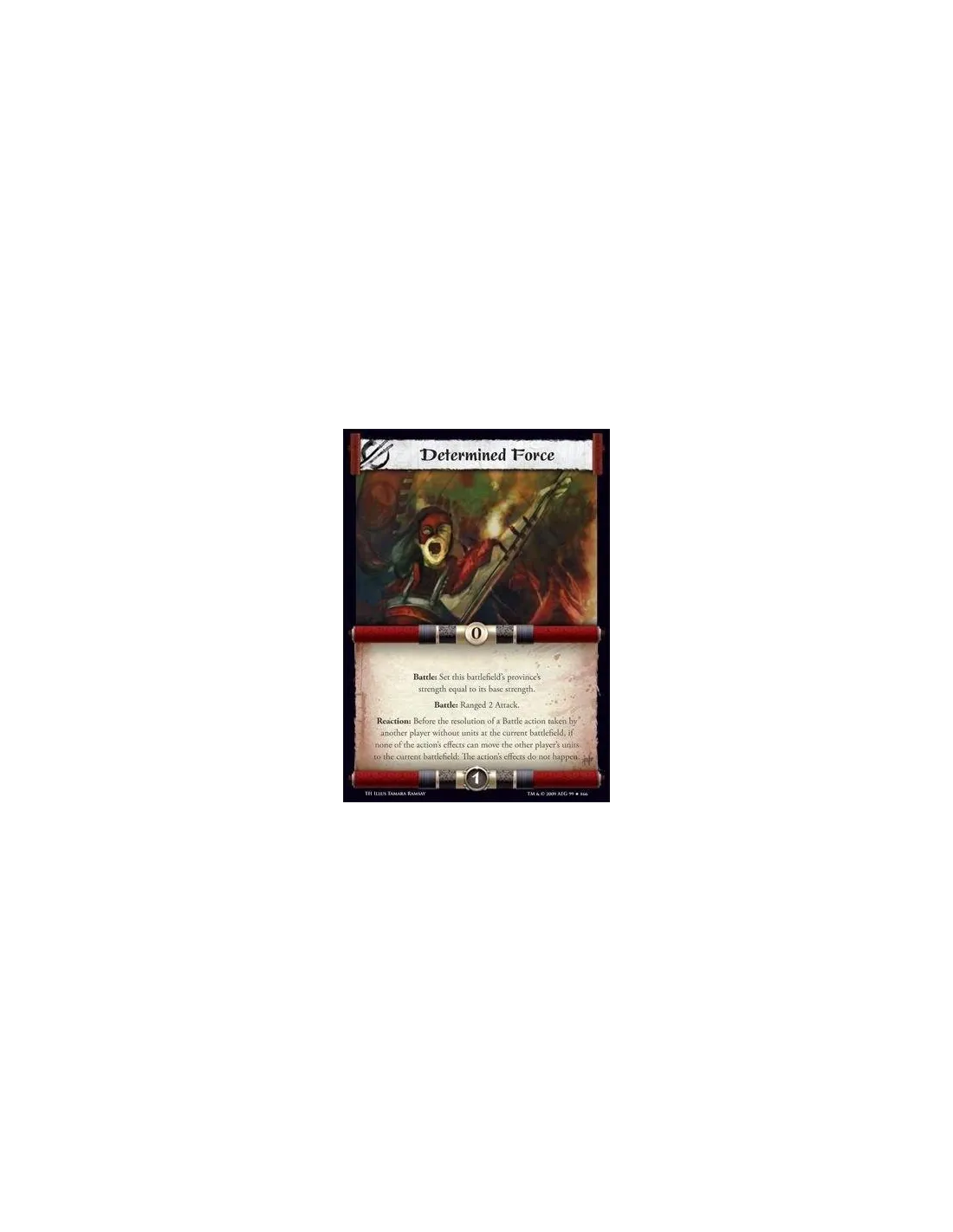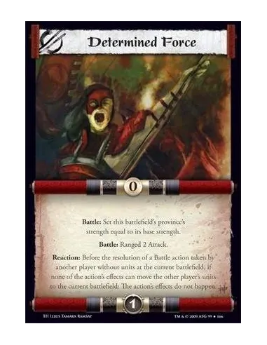 Battle: Set this battlefield’s province’s strength equal to its base strength. Battle: Ranged 2 Attack. Reaction: Before the resolution of a Battle action taken by another player without units at the current battlefield, if none of the action’s effects can move the other player’s units to the current battlefield: The action’s effects do not happen.