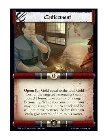 Open: Pay Gold equal to the total Gold Cost of the targeted Personality’s unit: Lose 3 Honor. Take control of a target Personality. While you control him, you may not assign his unit to attack and he will not move to attack. Before this turn ends, give control of him to his owner.