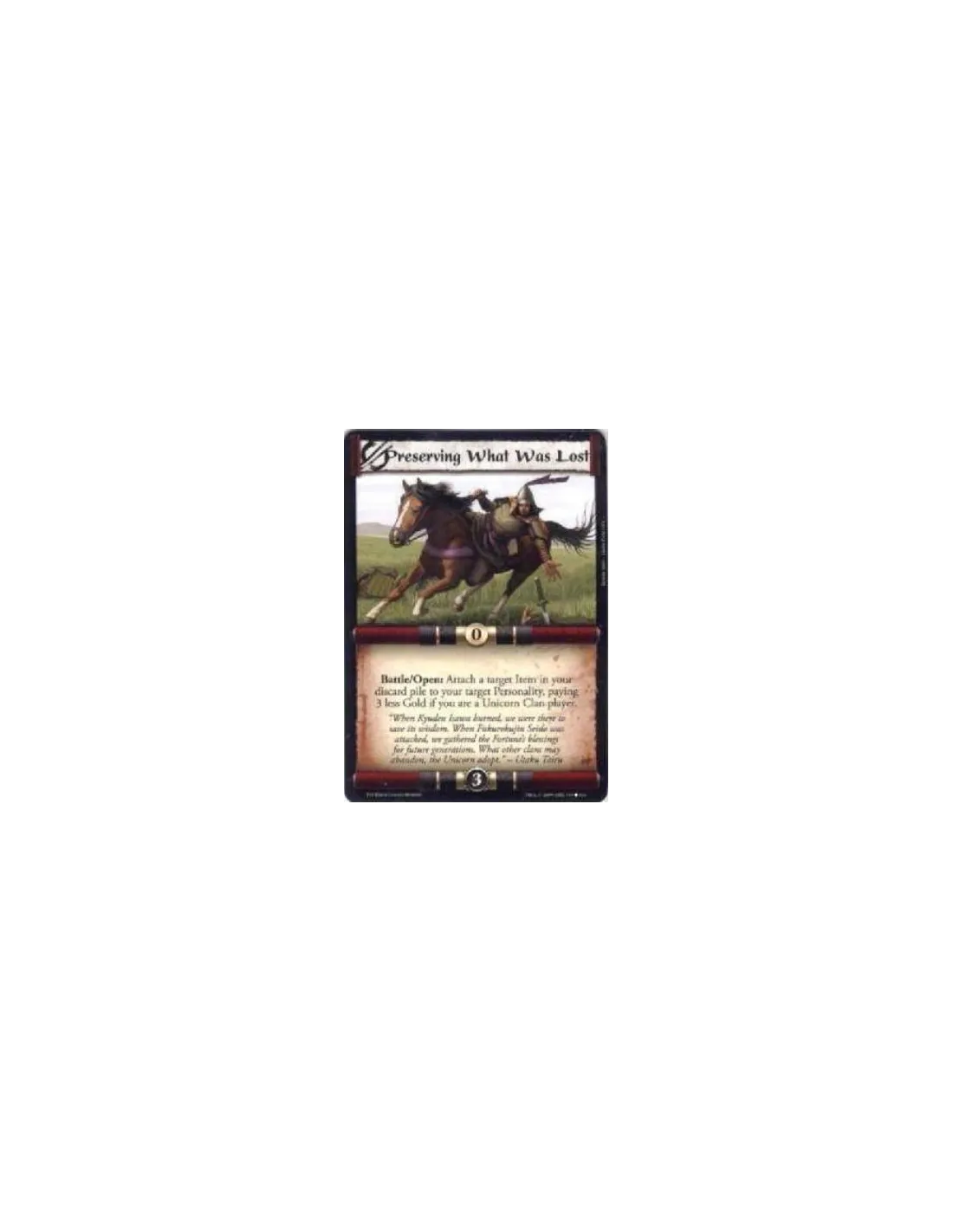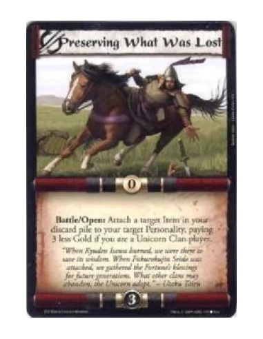 Battle/Open: Attach a target Item in your discard pile to your target Personality, paying 3 less Gold if you are a Unicorn Clan player.