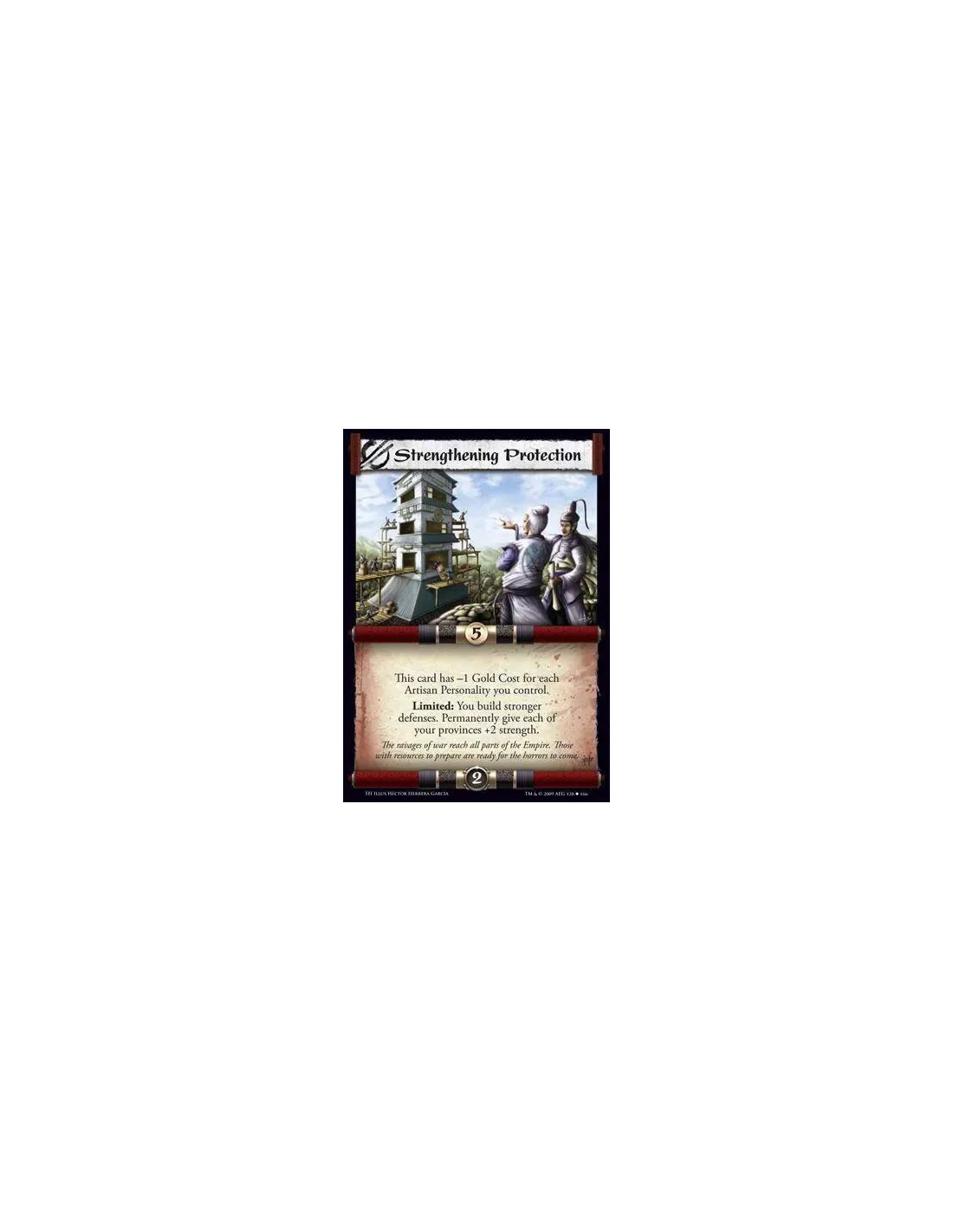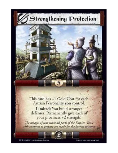 This card has -1 Gold Cost for each Artisan Personality you control. Limited: You build stronger defenses. Permanently give each of your provinces +2 strength.