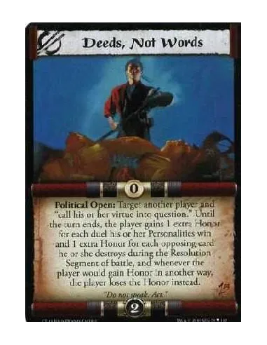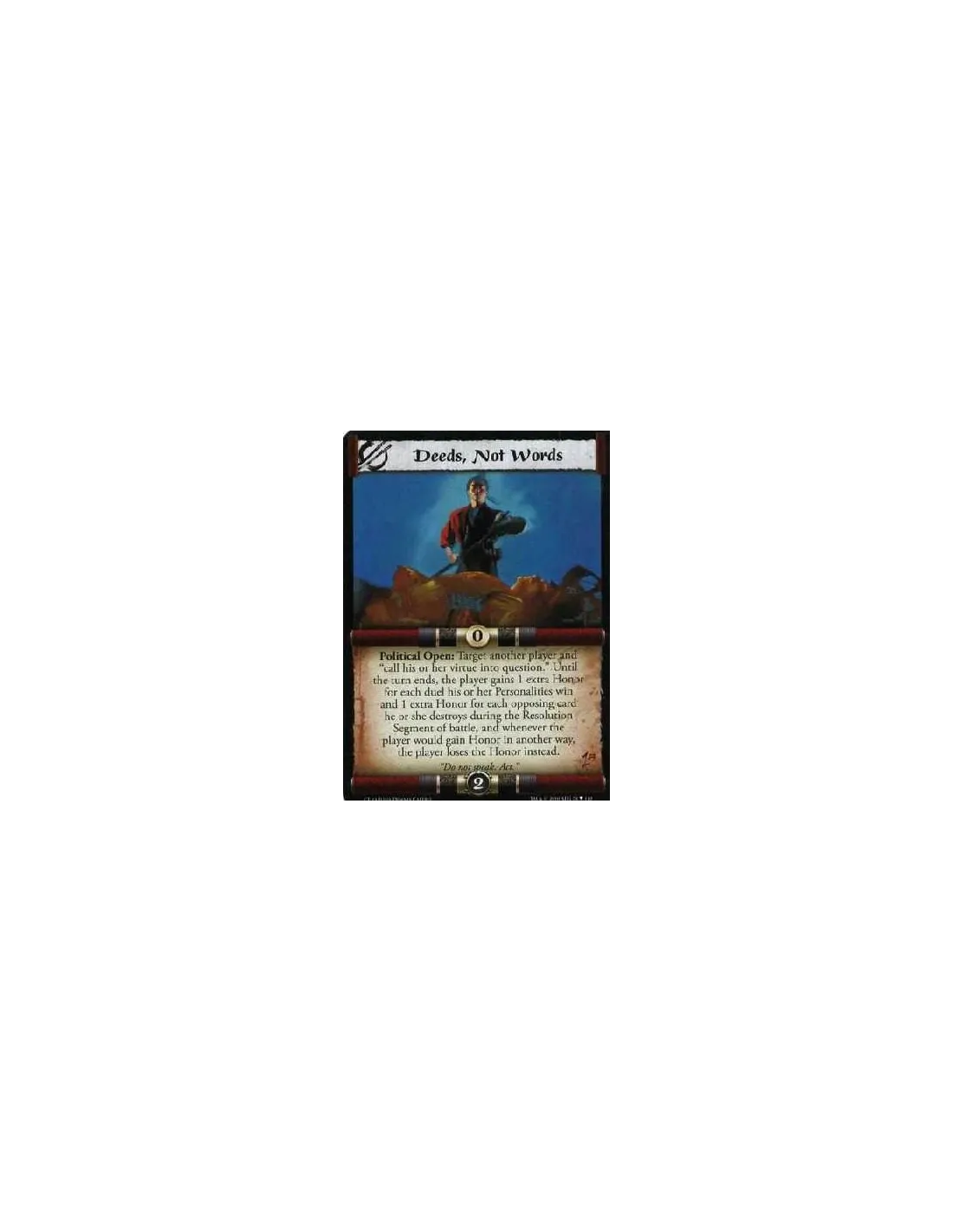Political Open: Target another Player and "call his or her virtue into question." Until the turn ends, the player gains 1 extra Honor for each duel his or her Personalities win and 1 extra Honor for each opposing card he or she destroys during the resolution Segment of battle, and whenever the player would gain Honor in another way, the player loses Honor instead.