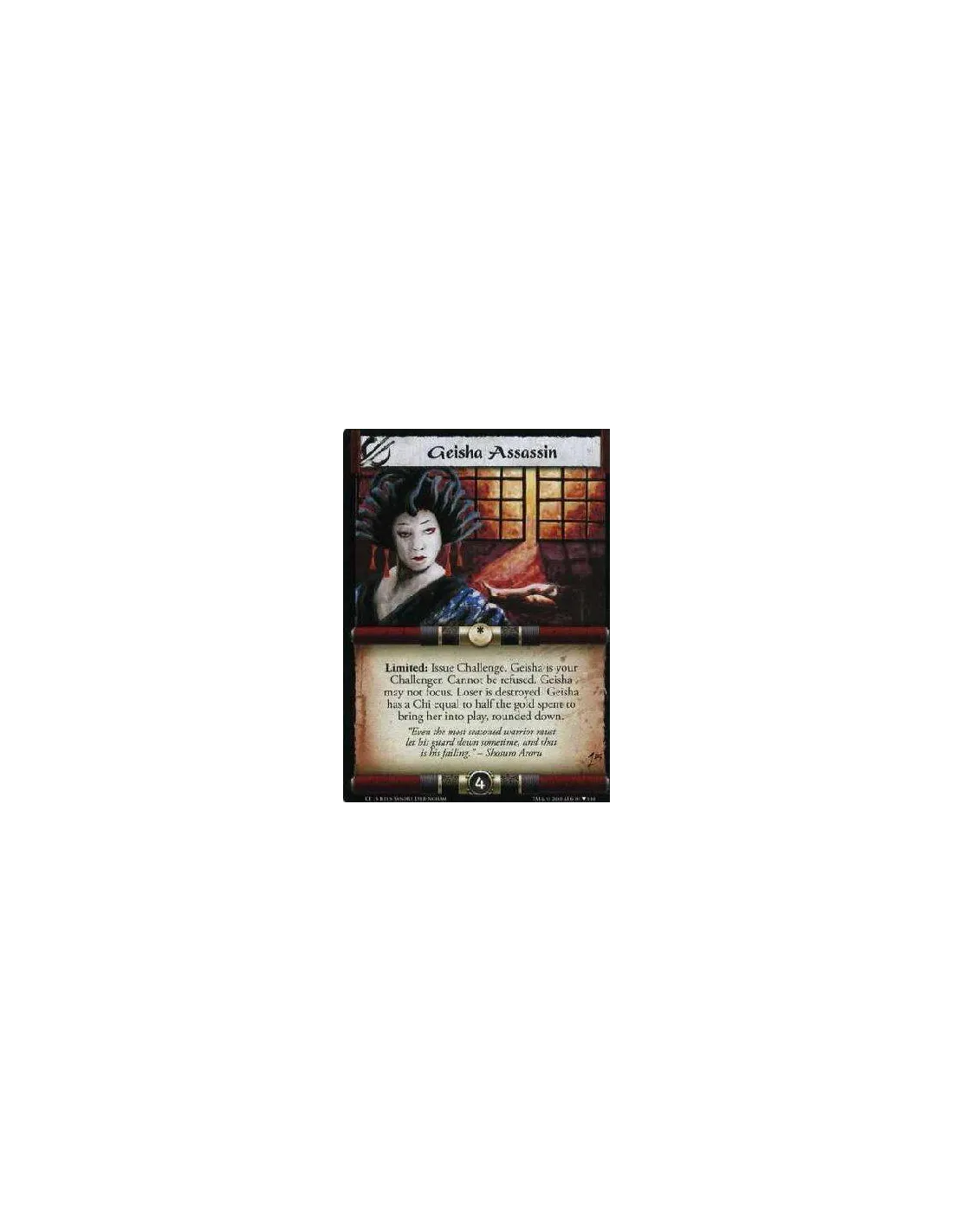 Limited: Issue Challenge. Geisha is your Challenger. Cannot be refused. Geisha may not focus. Geisha has a Chi equal to half the gold spent to bring her into play, rounded down.