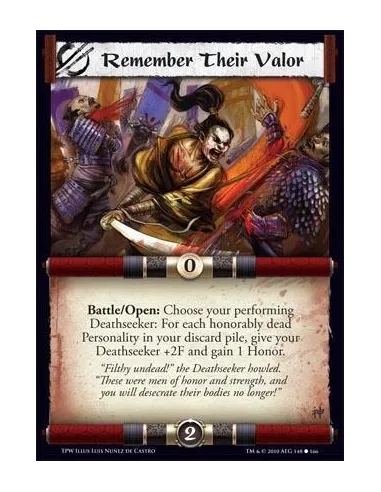 Battle/Open: Choose your performing Deathseeker: For each honorably dead Personality in your discard pile, give your Deathseeker +2F and gain 1 Honor.