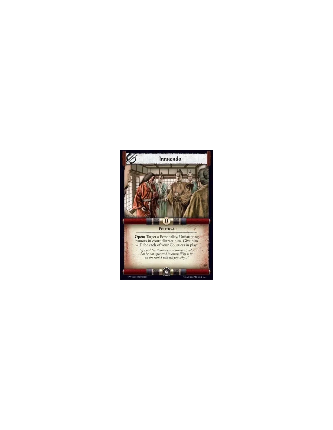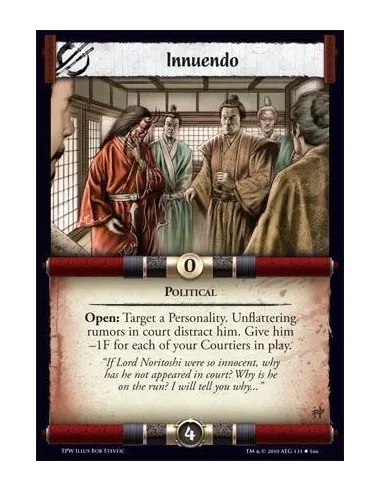 Political Open: Target a Personality. Unflattering rumors in court distract him. Give him -1F for each of your Courtiers in play.