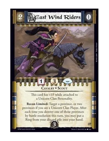 Cavalry • Scout This card has +1F while attached to a Unicorn Clan Personality. Recon Limited: Target a province, or two provinces if you are a Unicorn Clan Player. After each time you destroy one of those provinces by battle resolution this turn, you may put a Ring from your discard pile into your hand.