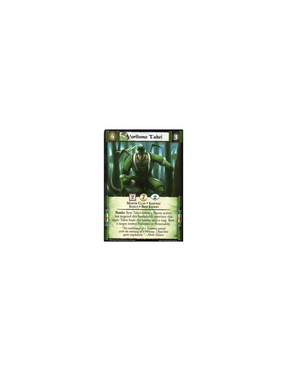 Mantis Clan • Samurai • Scout • Trap Expert Battle: Bow Tahei unless a Recon action has targeted this battlefield’s province this turn: Tahei leads the enemy into a trap. Bow a target enemy Follower or Personality.