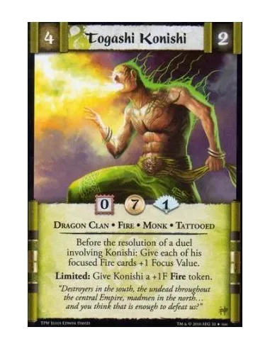 Dragon Clan • Fire • Monk • Tattooed Before the resolution of a duel involving Konishi: Give each of his focused Fire cards +1 Focus Value. Limited: Give Konishi a +1F Fire token.