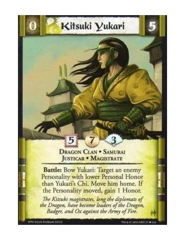 Dragon Clan • Samurai• Justicar • Magistrate Battle: Bow Yukari: Target an enemy Personality with lower Personal Honor than Yukari’s Chi. Move him home. If the Personality moved, gain 1 Honor.