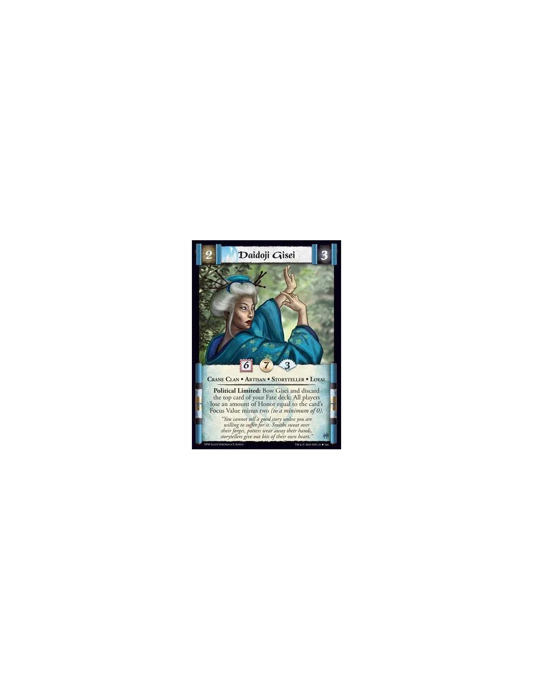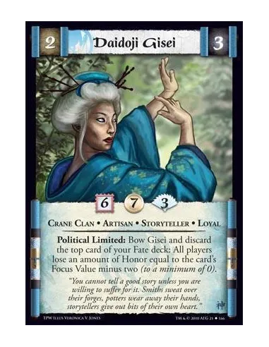 Crane Clan * Artisan * Storyteller * Loyal Political Limited: Bow Gisei and discard the top card of your Fate Deck: All players lose an amount of Honor equal to the card's Focus Value minus two (to a minimum of 0).