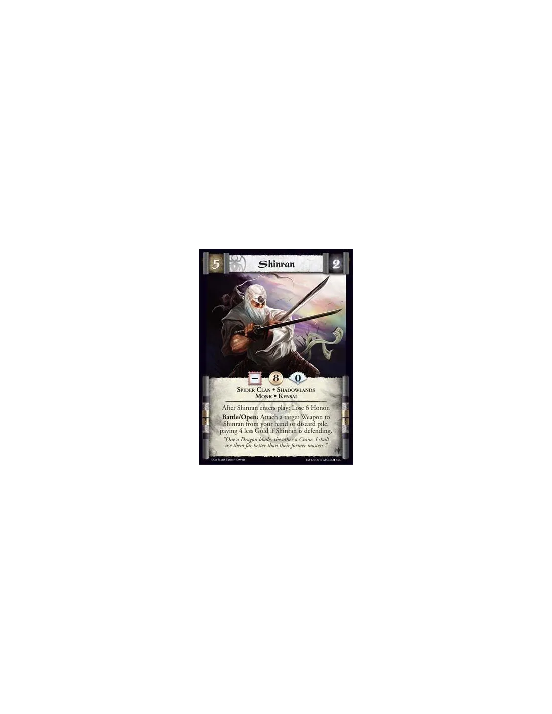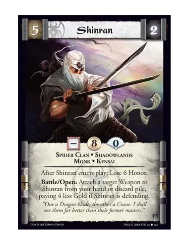 Spider Clan • Shadowlands • Monk • Kensai After Shinran enters play: Lose 6 Honor. Battle/Open: Attach a target Weapon to Shinran from your hand or discard pile, paying 4 less Gold if Shinran is defending.