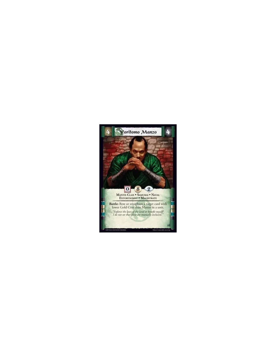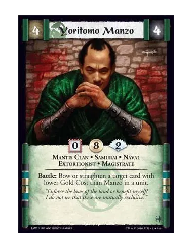 Mantis Clan • Samurai • Naval • Extortionist • Magistrate Battle: Bow or straighten a target card with lower Gold Cost than Manzo in a unit.