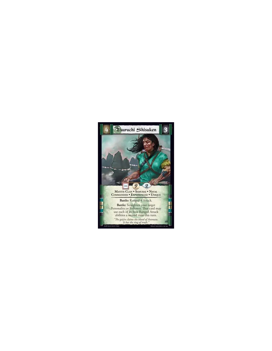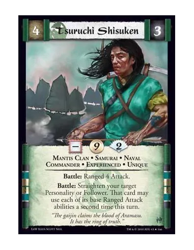 Mantis Clan • Samurai • Naval • Commander • Experienced • Unique Battle: Ranged 4 Attack. Battle: Straighten your target Personality or Follower. That card may use each of its base Ranged Attack abilities a second time this turn.