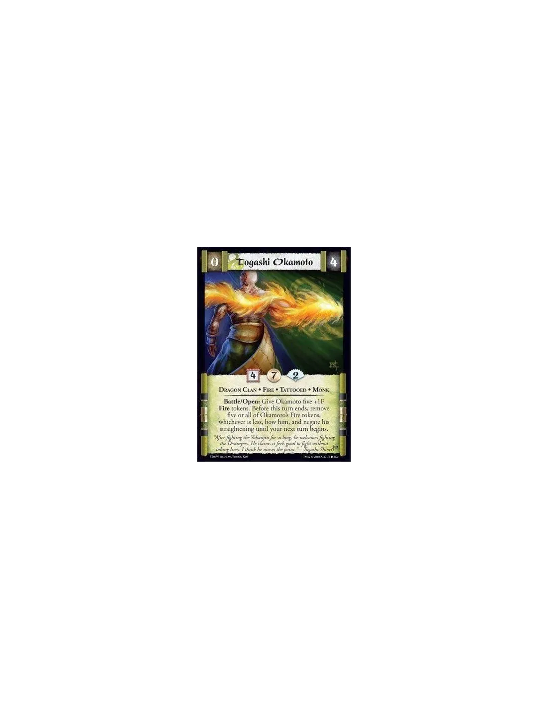 Dragon Clan • Fire • Tattooed • Monk Battle/Open: Give Okamoto five +1F Fire tokens. Before this turn ends, remove five or all of Okamoto’s Fire tokens, whichever is less, bow him, and negate his straightening until your next turn begins.