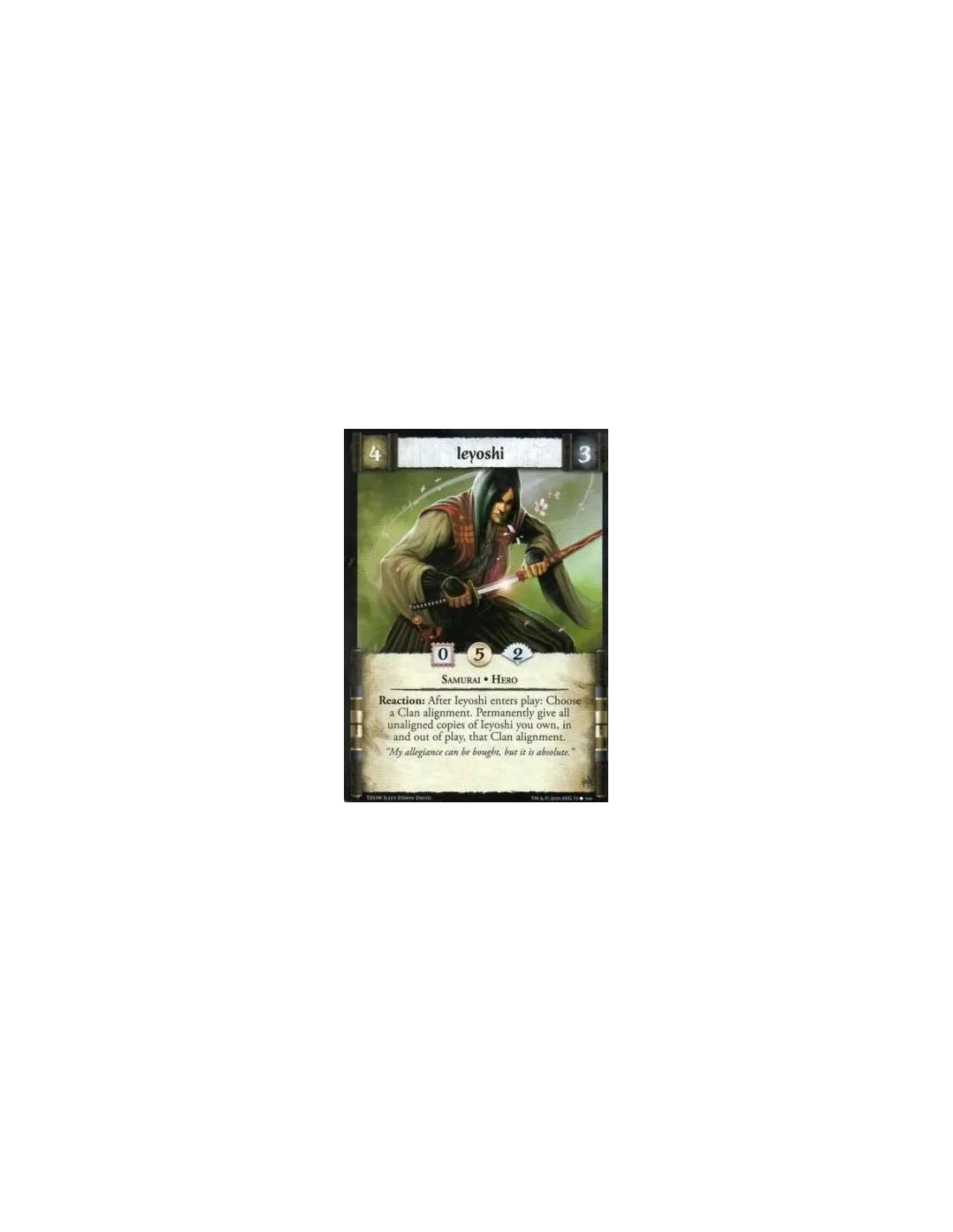 Samurai • Hero Reaction: After Ieyoshi enters play: Choose a Clan alignment. Permanently give all unaligned copies of Ieyoshi you own, in and out of play, that Clan alignment.