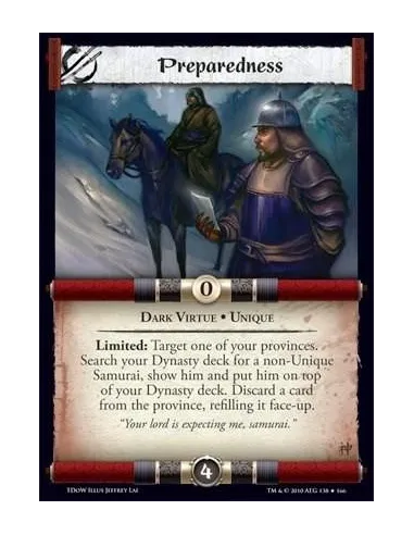 Dark Virtue • Unique Limited: Target one of your provinces. Search your Dynasty deck for a non-Unique Samurai, show him and put him on top of your Dynasty deck. Discard a card from the province, refilling it face-up.