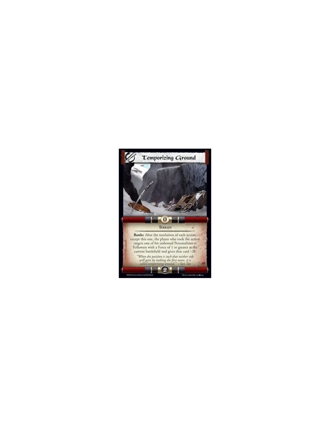Terrain Battle: After the resolution of each action, except this one, the player who took the action targets one of his unbowed Personalities or Followers with a Force of 1 or greater at the current battlefield and gives that card -3F.