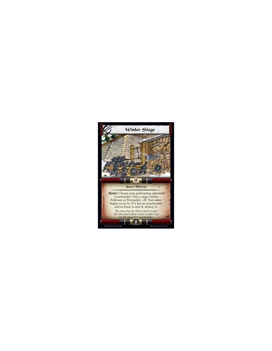Siege • Winter Battle: Choose your performing unbowed Commander: Give a target enemy Follower or Personality -4F. Starvation begins to set in. If it has no attachments and its Force is now 0, destroy it.