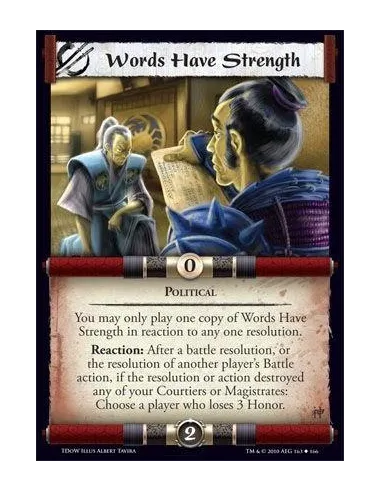 Political You may only play one copy of Words Have Strength in reaction to any one resolution. Reaction: After a battle resolution, or the resolution of another player’s Battle action, if the resolution or action destroyed any of your Courtiers or Magistrates: Choose a player who loses 3 Honor.