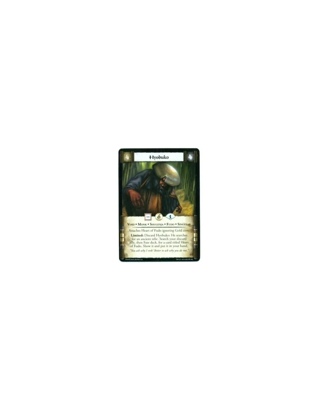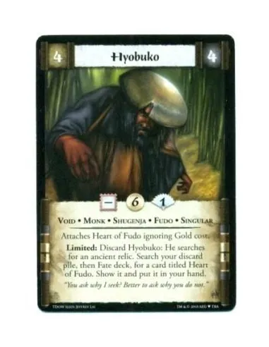 Attaches Heart of Fudo ignoring Gold cost. Limited: Discard Hyobuko: He searches for an ancient relic. Search your discard pile, then Fate deck, for a card titled Heart of Fudo. Show it and put it in your hand.