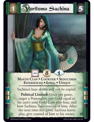 Sachina’s base ability will not be copied. Political Limited: Once per game, target a Personality, pay Gold equal to his unit’s total Gold Cost plus four, and bow Sachina: Take control of him. After the next time this game Sachina leaves play, give control of him to his owner.