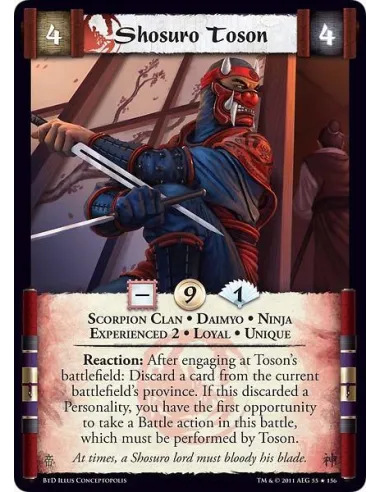 Reaction: After engaging at Toson’s battlefield: Discard a card from the current battlefield’s province. If this discarded a Personality, you have the first opportunity to take a Battle action in this battle, which must be performed by Toson.