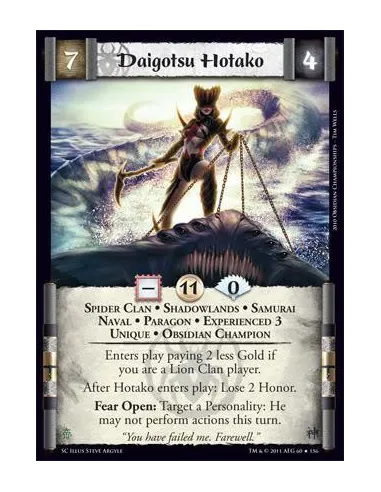 Enters play paying 2 less Gold if you are a Lion Clan player. After Hotako enters play: Lose 2 Honor. Fear Open: Target a Personality: He may not perform actions this turn.