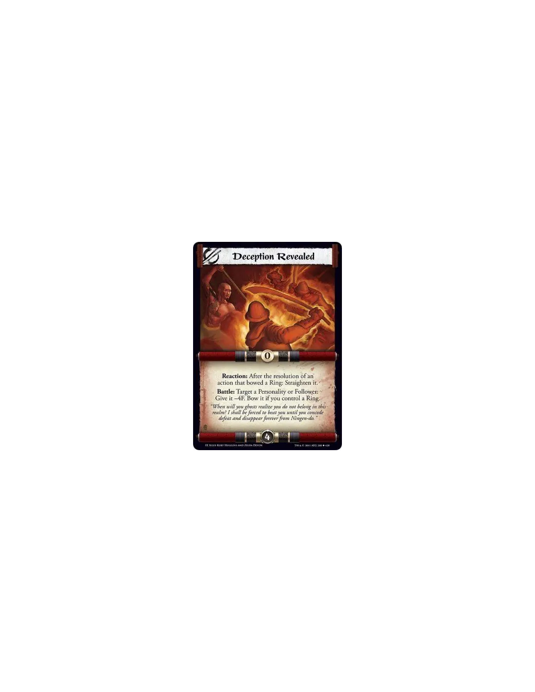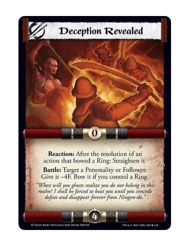 Reaction: After the resolution of an action that bowed a Ring: Straighten it. Battle: Target a Personality or Follower: Give it –4F. Bow it if you control a Ring.