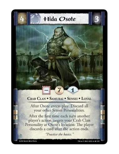 After Osote enters play: Discard all your other Sensei Personalities. After the first time each turn another player's action targets your Crab Clan Personality at Osote's location: The player discards a card after the action ends.