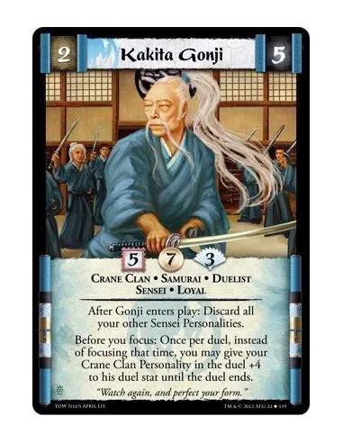 After Gonji enters play: Discard all your other Sensei Personalities. Before you focus: Once per duel, instead of focusing that time, you may give your Crane Clan Personality in the duel +4 to his duel stat until the duel ends.