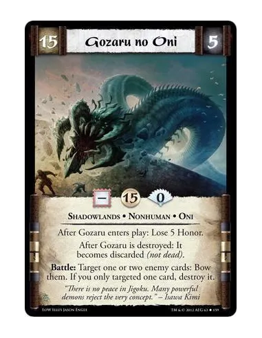 After Gozaru enters play: Lose 5 Honor. After Gozaru is destroyed: It becomes discarded (not dead). Battle: Target one or two enemy cards: Bow them. If you only targeted one card, destroy it.