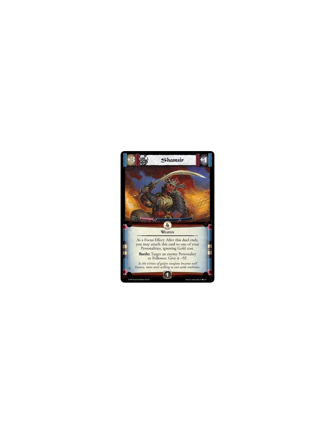 As a Focus Effect: After this duel ends, you may attach this card to one of your Personalities, ignoring Gold cost. Battle: Target an enemy Personality or Follower: Give it -5F.