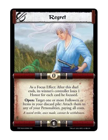 As a Focus Effect: After this duel ends, its winner’s controller loses 1 Honor for each card he focused. Open: Target one or more Followers or Items in your discard pile: Attach them to any of your Personalities, paying all costs.