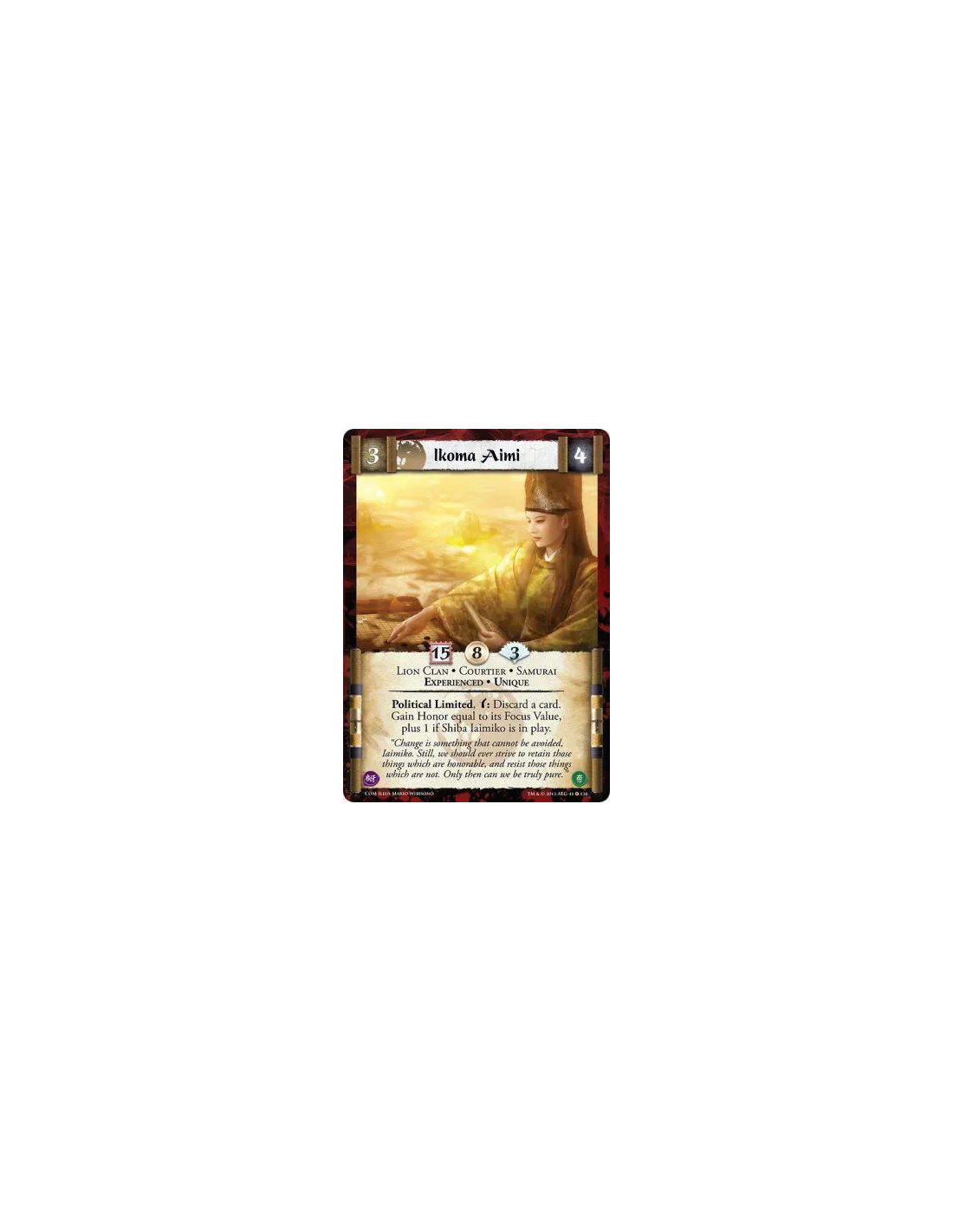 Political Limited, w: Discard a card. Gain Honor equal to its Focus Value, plus 1 if Shiba Iaimiko is in play.