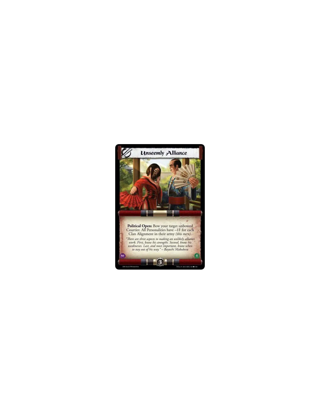 Political Open: Bow your target unbowed Courtier. All Personalities have -1F for each Clan Alignment in their army (this turn).