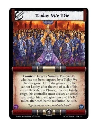 Limited: Target a Samurai Personality who has not been targeted by a Today We Die this game. Until the game ends, he cannot Lobby, after the end of each of his controller's Action Phases, if he can legally assign, his controller must declare an attack and assign him, and give him a +1F/+1C token after each battle resolution he is in.