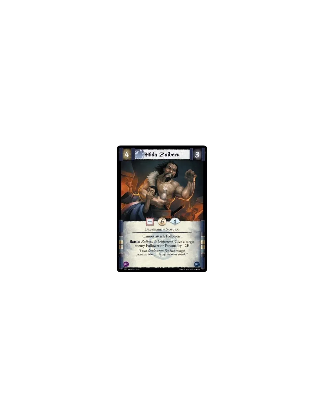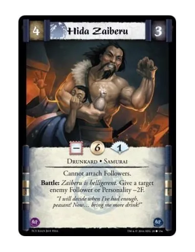 Battle: Zaiberu is belligerent. Give a target enemy Follower or Personality -2F. time the action discards or shows any cards, you may give them +1FV. (Focused cards cannot gain this bonus.)