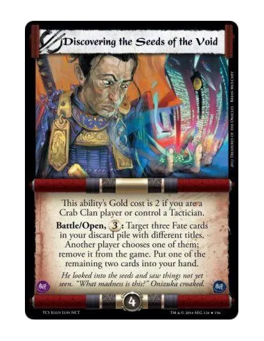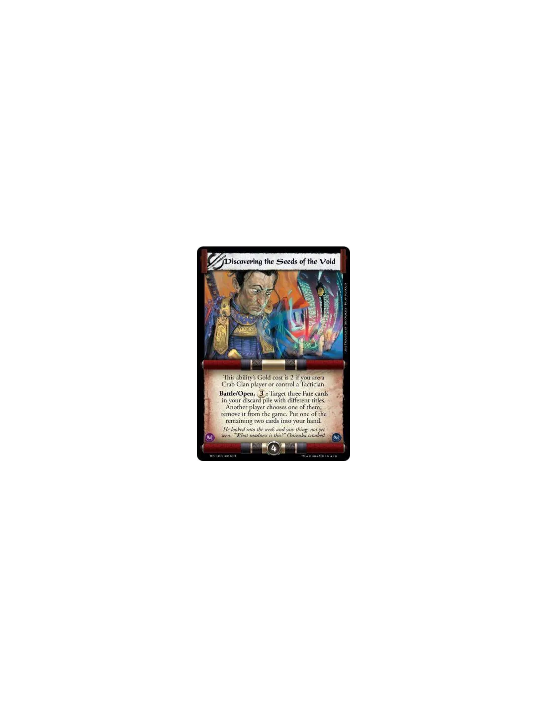 Battle/Open, 3: Target three Fate cards in your discard pile with different titles. Another player chooses one of them; remove it from the game. Put one of the remaining two cards into your hand.